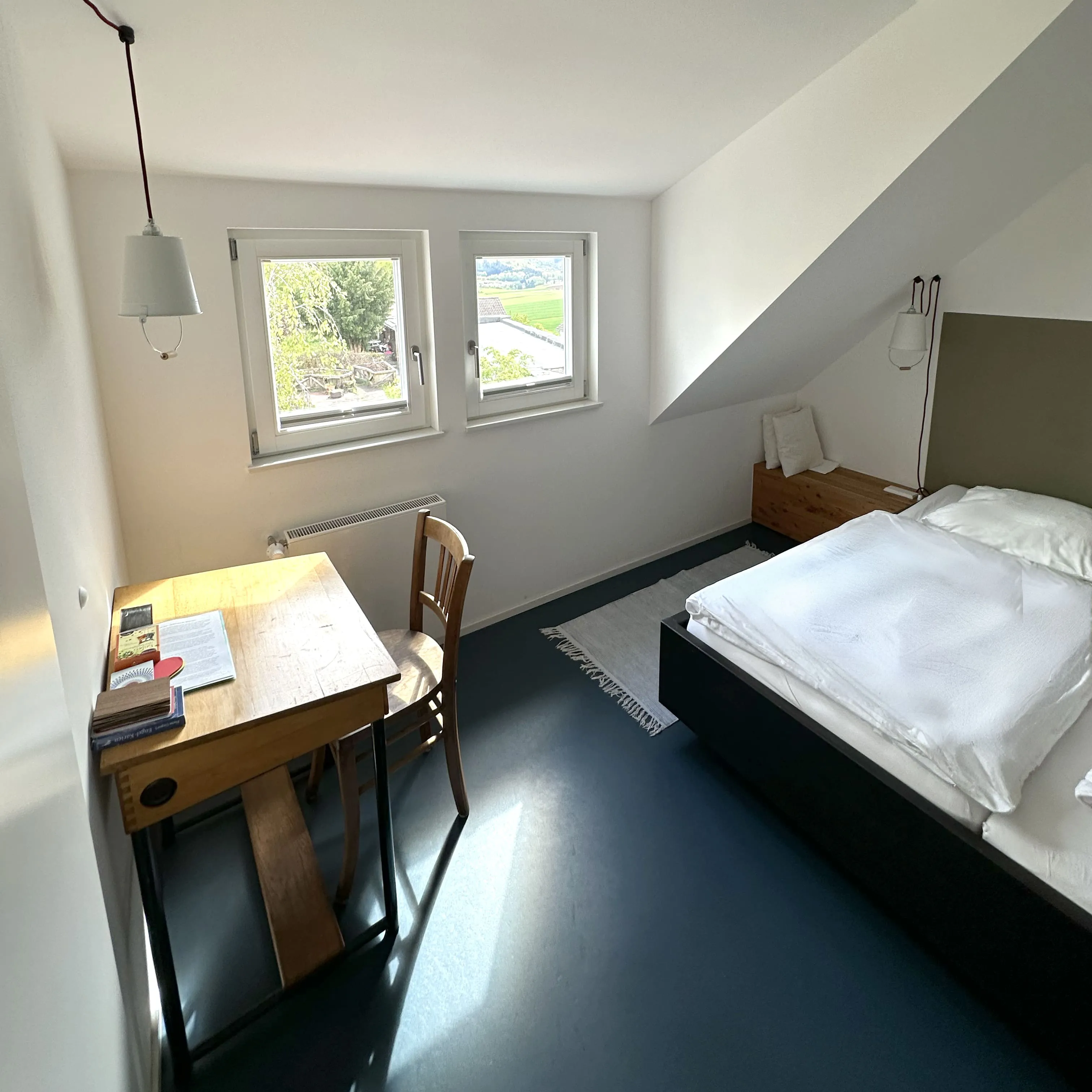 Das gemütliche Gästehaus mit nur 15 Zimmern bietet eine wohltuend entspannte Atmosphäre. Der 120 m² große, lichtdurchflutete Seminarraum mit Holzboden lädt zum Wohlfühlen ein, mit weitem Blick über die Hügel und den Sonnenaufgang am Morgen. Direkt vom Haus führen zu jeder Jahreszeit herrliche Wege in die Natur. Jedes Zimmer ist ein Unikat, mal mit gemütlicher Dachschräge, mal mit Ecken und Winkeln, mal klein und heimelig oder großzügig mit Blick ins Tal.